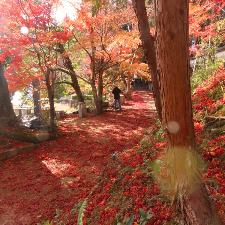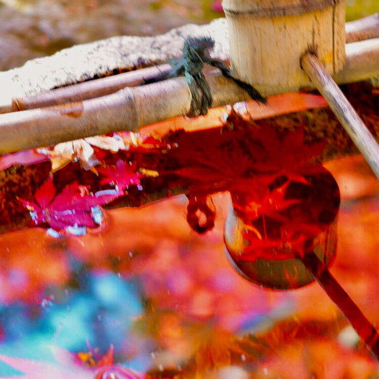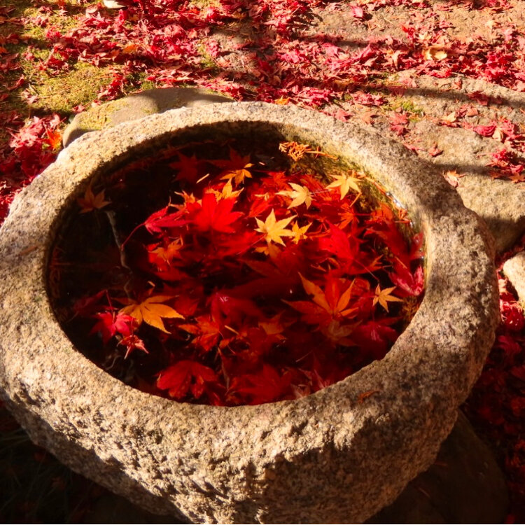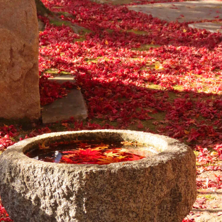 参道の途中にある蹲。おじさま達が立ち止まって、お互いの撮れた写真を見せながら「さっきの方が良かったね」とか「風が止んだので、今がチャンス」とかおっしゃられてたので、お邪魔しないように端から撮らせてもらってたら、「こっちから撮ったら、紅葉が綺麗に撮れますよ」と