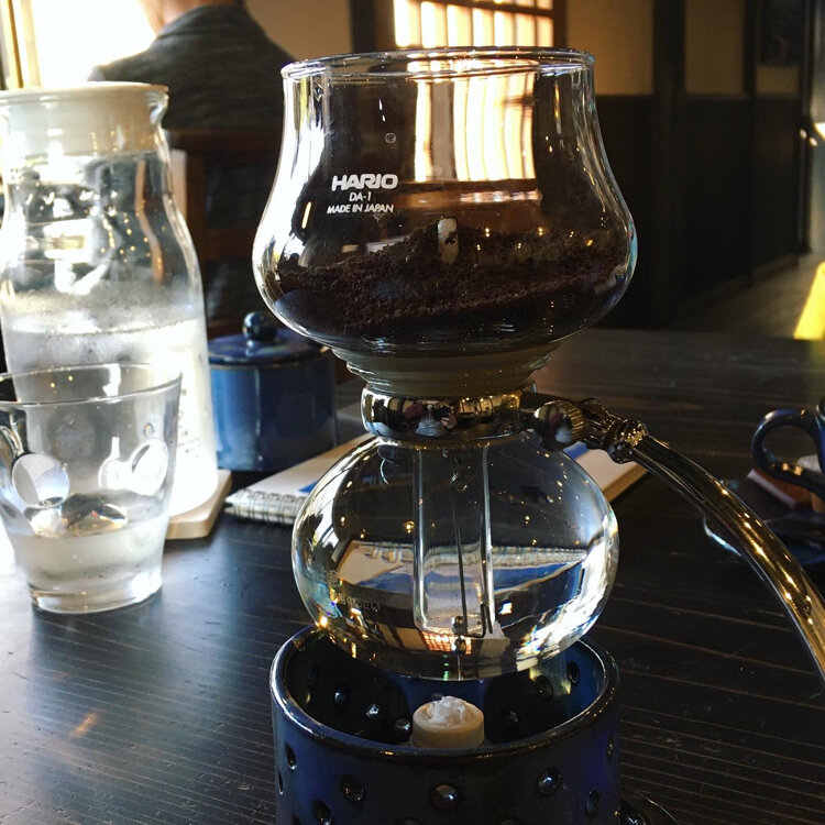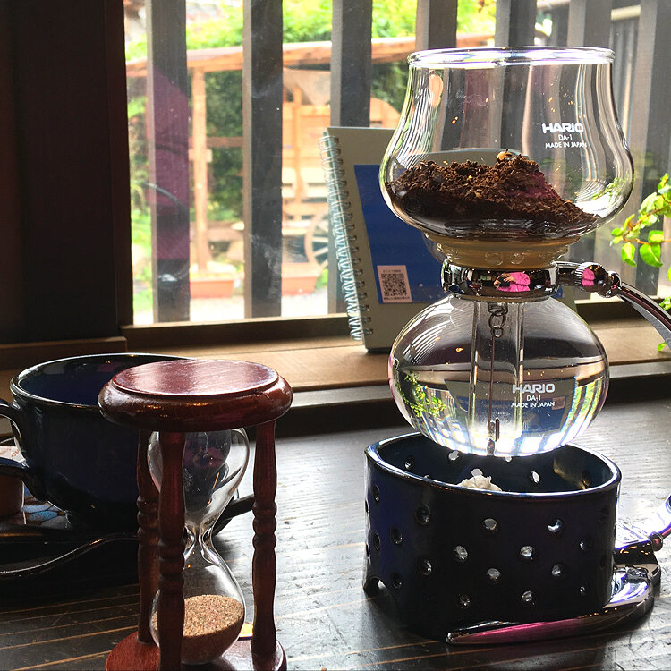 そして味わう珈琲。自分で豆をミルで挽き、サイフォンで入れるコーヒーは格別です。味しかり、細かくなっていく豆の感触、サイフォンに移す時の匂い、五感で楽しめる珈琲でした。