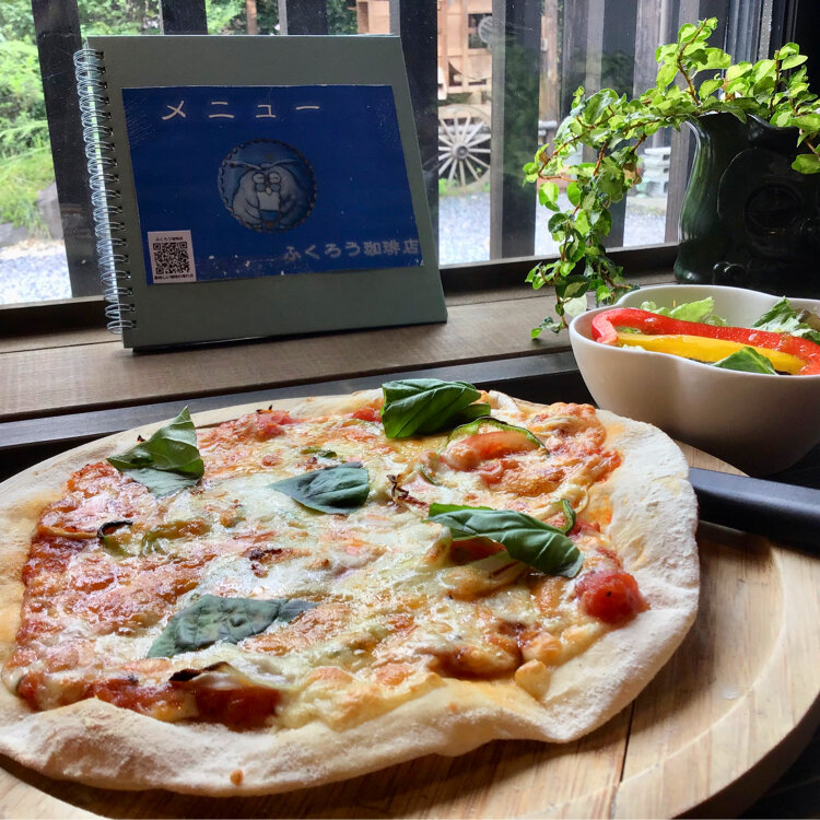 店内にはふくろうの置き物がちらり。そして窓から見える薪と窯。