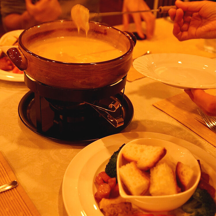 チーズフォンデュのほかにも、前菜に始まり、あったかいスープ、肉料理、デザートとおいしくて大満足の内容。