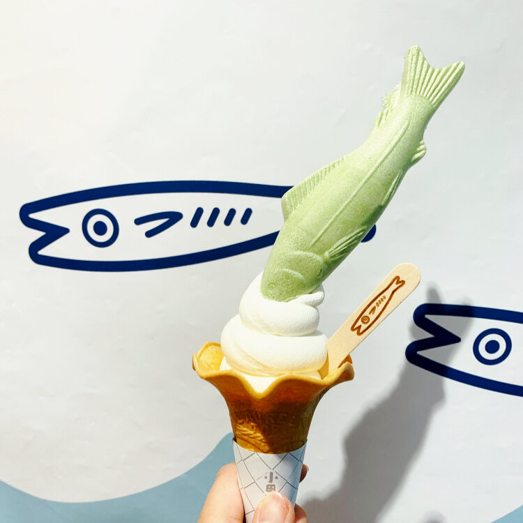 漁港の駅 TOTOCO小田原 海鮮丼の後は、「小田原港プリン」さんのソフトクリーム🍦魚が刺さってるっ🍦🐟 魚の他にお城もあって、迷いに迷って🐟にしました! 美味しいし可愛いし💕 海鮮丼でお腹パンパンなのに、スイーツは別腹です🙌 #TOTOCO小田原 #早川漁港 #小田原 #早川 #ソフトクリーム #小田原港プリン