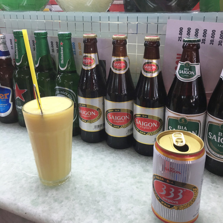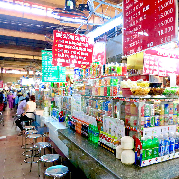 所狭しと並べられた飲み物、チェー(ベトナムぜんざい)やココナッツなど、ベトナムらしさを感じるコーナー。