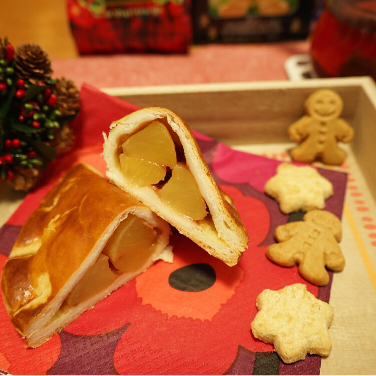 以前、紀ノ国屋で購入した似たような形のチェリーパイがおいしかったのでこちらもいただいてみました。トースターで温めてあったかアップルパイをPartridgesのフレーバーティーと一緒に。ごろごろりんごが存在感たっぷりで、シナモンがほどよく香っておいしかったです。