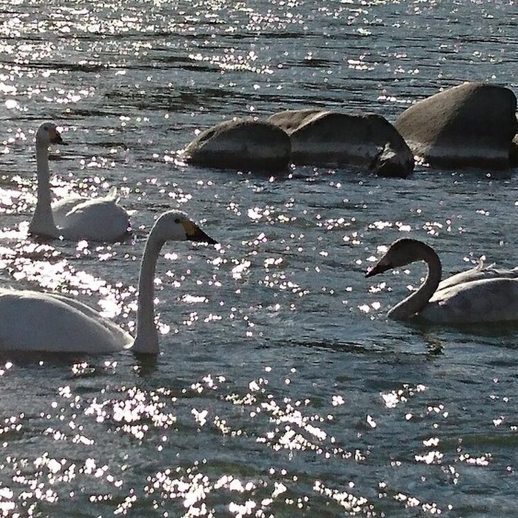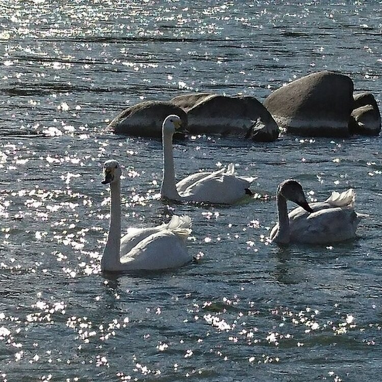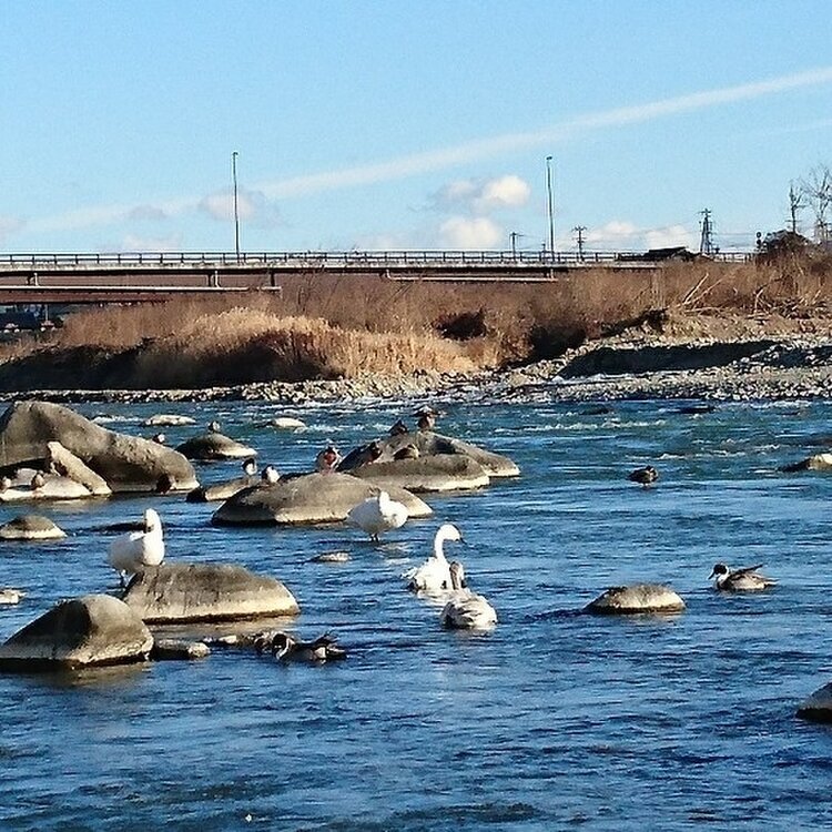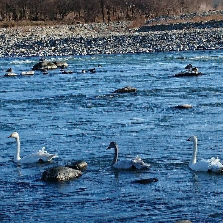 信州〜冬景色〜 この冬も、近くの千曲川に白鳥たちが来てくれました🎵 キラキラ光る穏やかな川の流れと、冷たい風と、白鳥たちの鳴き声に癒されました😊