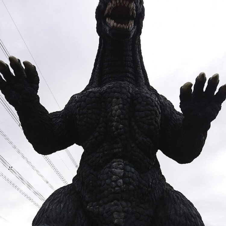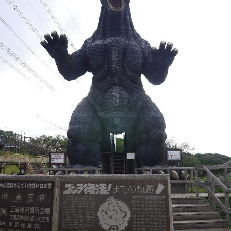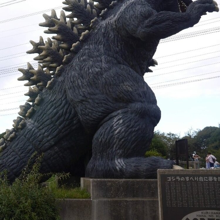 横須賀の久里浜にある花の国にあるゴジラの滑り台。 東宝と特技監督の川北紘一の協力を得て製作された公式品で子供には大人気のアトラクション。 全長10.04メートルで残念ながら大人は滑れない。