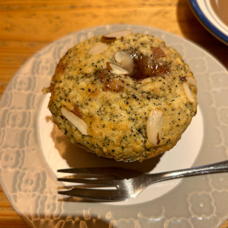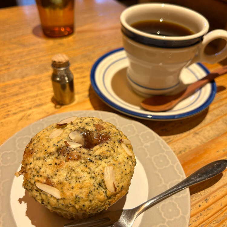 カフェのカウンターには焼き立てのマフィン、スコーンが良い香りで並んでいます。💛
