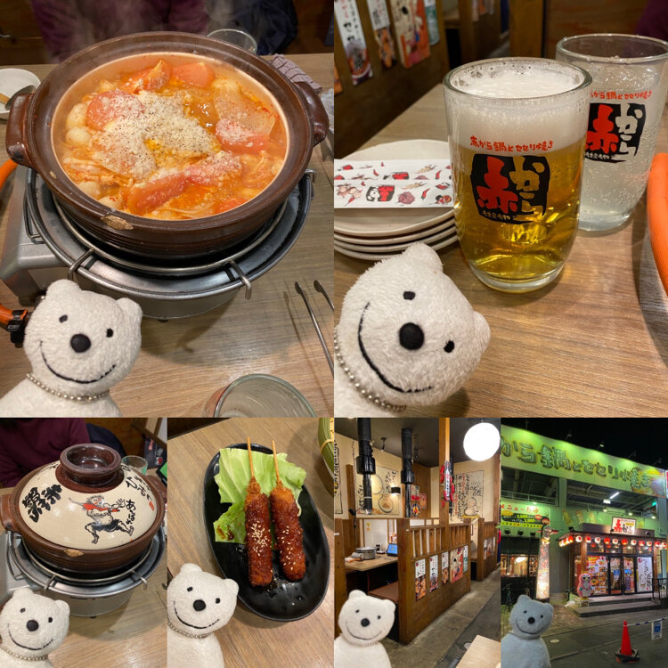 クマ散歩:赤からで品行方正なクマは、トマチー赤から鍋、味噌串カツ、バリバリキャベツ、生ビール中ジョッキ、レモンサワー&金黒芋ソーダ割りの沼津の夜 The Bear had a drink with Tomachee Akakara Spicy Hot Pot, Skewered Pork Cutlet with Miso Sauce, Crunchy Cabbage, M Mug of Beer on Draft, Lemon Sour & Kinkuro Sweet Potato Shochu and Soda at Akakara, Numazu!♪☆(*^o^*)