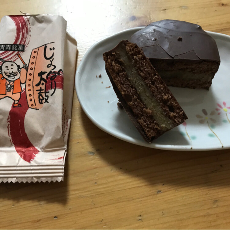 ①じょぱり太鼓(パッケージだけみると駄菓子のお煎餅が入ってるのに似てるのでお煎餅かと思いきやマロンクリームがサンドされたチョコパイでした!チョコが厚くて美味しいです!弘前土産におすすめです