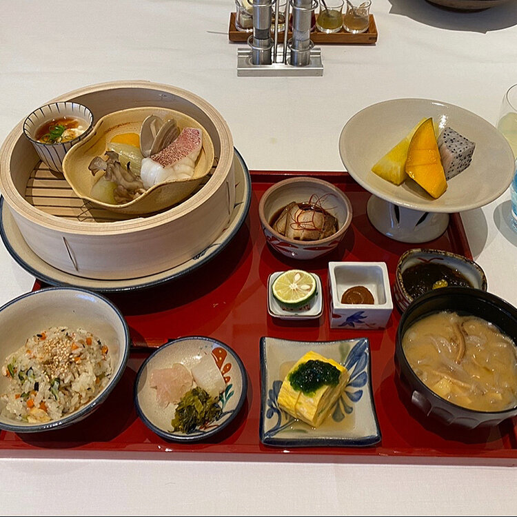 沖縄の滋味あふれる料理を少しずつ楽しみたい私は「琉球朝食」を、相方はインサラータアランチェ(オレンジのサラダ)から始まるシチリア朝食をいただきました。