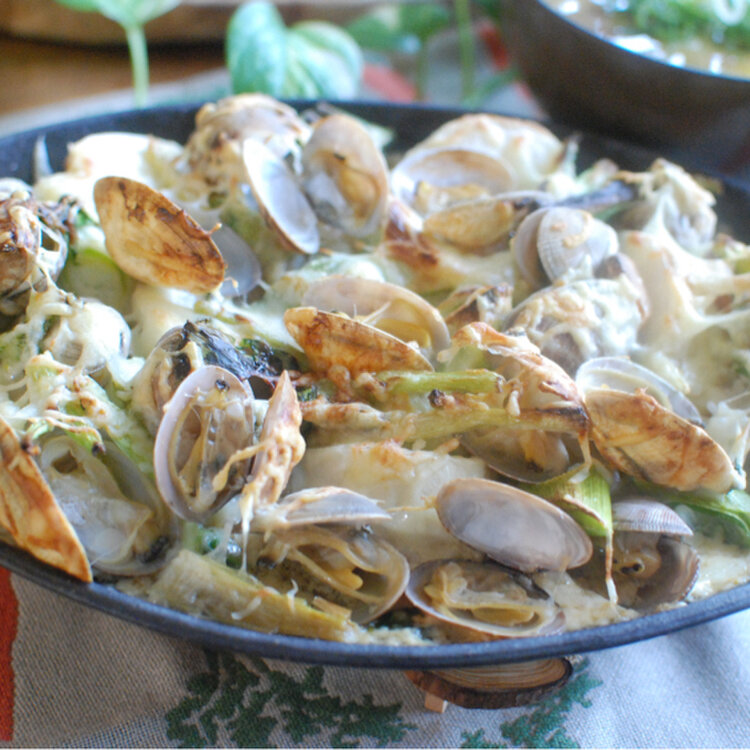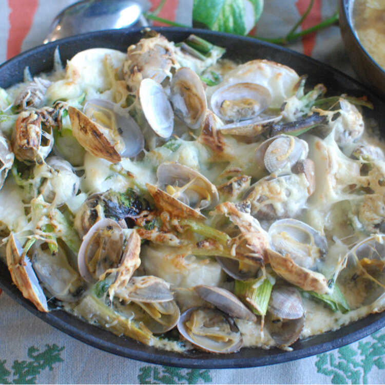・耐熱皿に炊いたご飯、その上にアサリ、