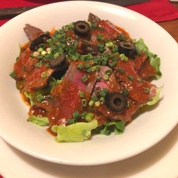 「牛肉のたたきのサラダ ジンジャーソース」「リコッタチーズと生ハムのパイ」