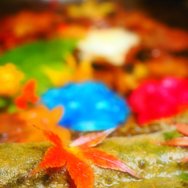 白い花手水の中に、赤や緑のクリスマスオーナメントがそっと浮かび、