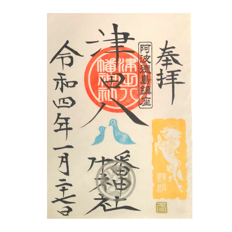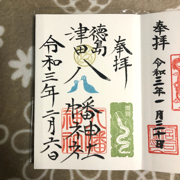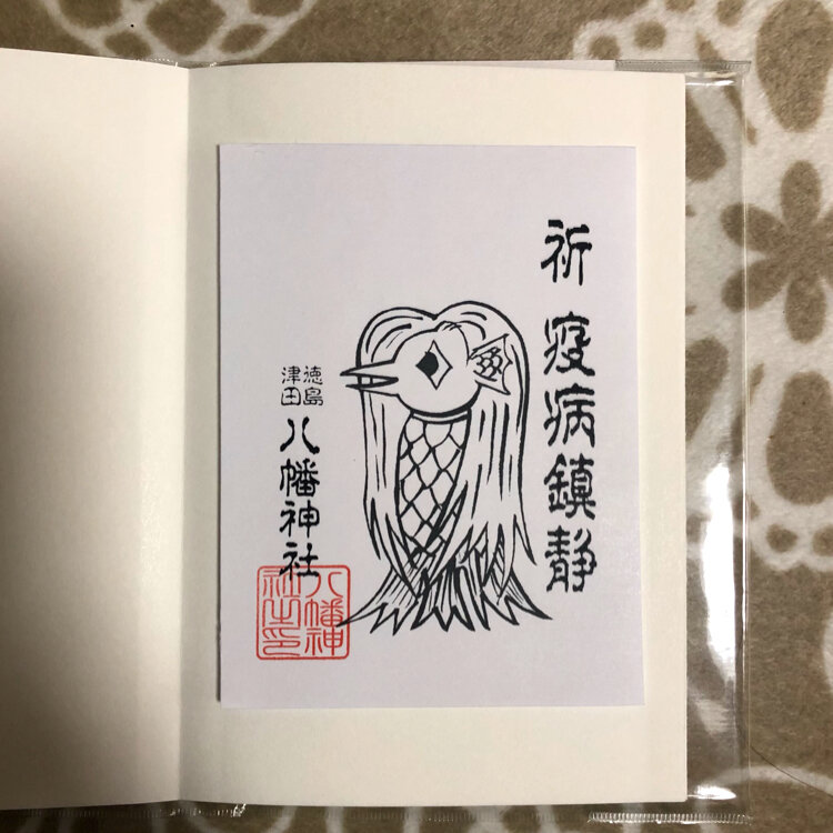八幡さまのお使いである鳩が青の「八」の字にデザインされた御朱印を頂いてきました。そして、アマビエ様の護符まで頂きました。かわいらしいアマビエ様♡玄関に貼って疫病退散!しかも