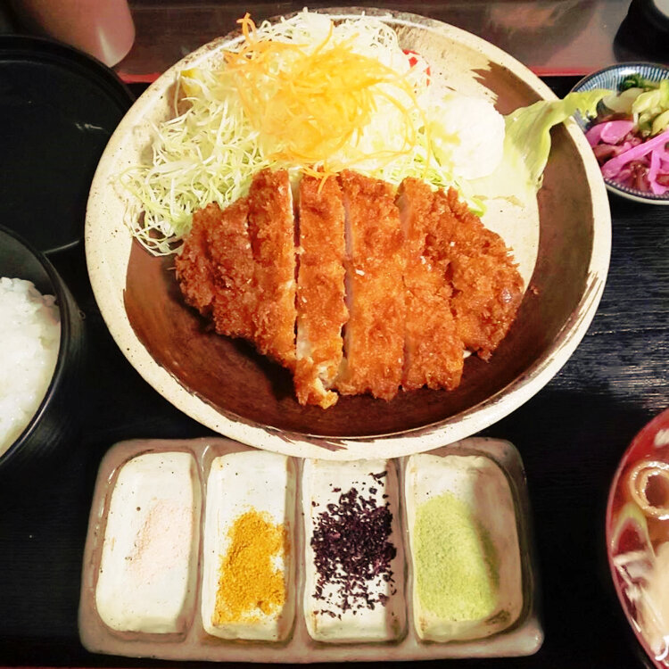塩とんかつ定食には、4種類の塩が付いて好みに合わせていただけます♪