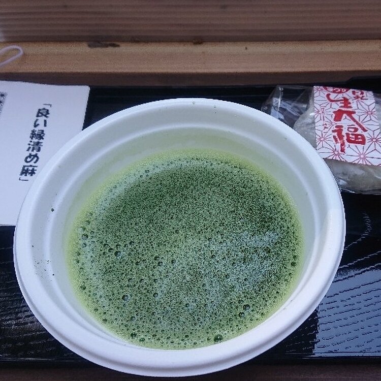 【開運Cafeあづまや(in二荒山神社)】 なぜ開運Cafeかと言うと、すぐ脇の、浄化・美容の湧き水を使用しているからです!美味しい&神聖なお水で点てられた抹茶は最高でした✨今は外のデッキスペースでいただけます♫ そして「よい縁清め麻」がセットで付いてきます✨ 大福も中にホイップクリームが入っててとっても美味しかったです♡