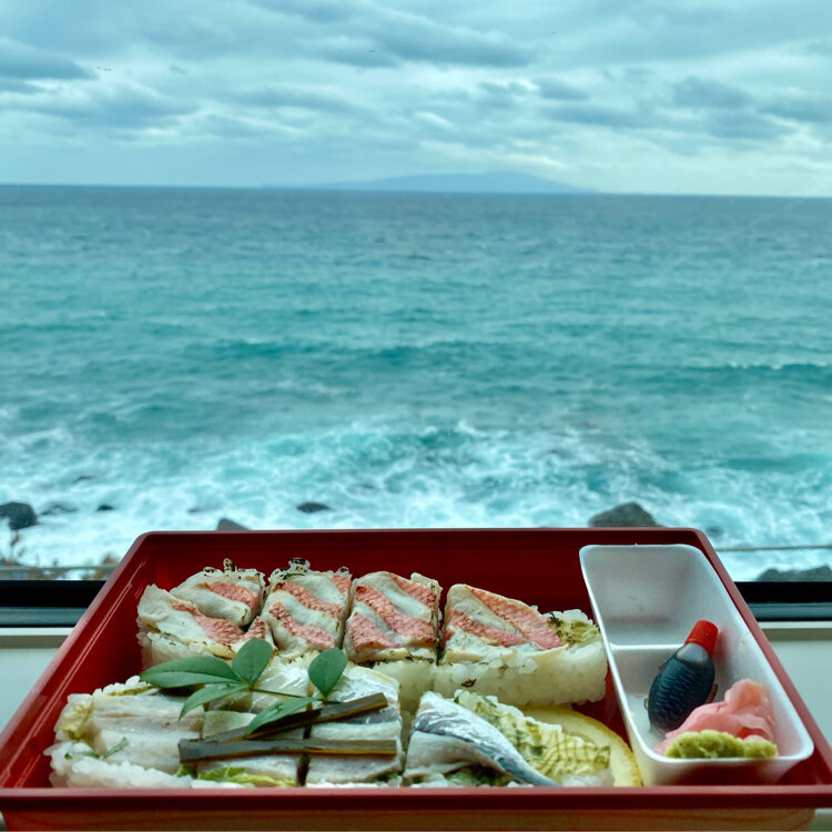 下田駅前に建つ“下田時計台フロント”で『金目鯛の炙り寿司と元祖あじの姿寿司』をテイクアウトし、踊り子号の車内で海を眺めながら。