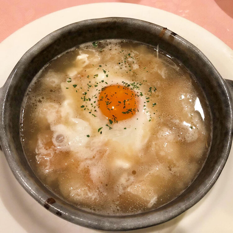 土鍋で提供されるアツアツの「にんにくスープ」は、癖になる一品♪