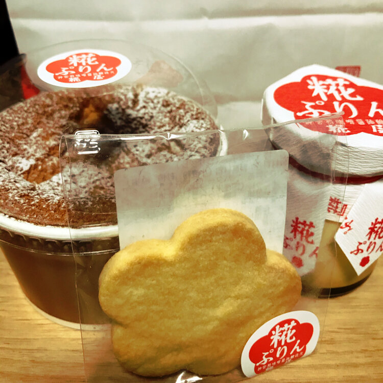 おかげ横丁にて新しいお店発見❣️ 左から糀ぷりんシフォンケーキ、糀サブレ、糀ぷりん✨ 創業200年の味噌醤油醸造元の糀屋さん。 たまり醤油が隠し味。 美味でした😋