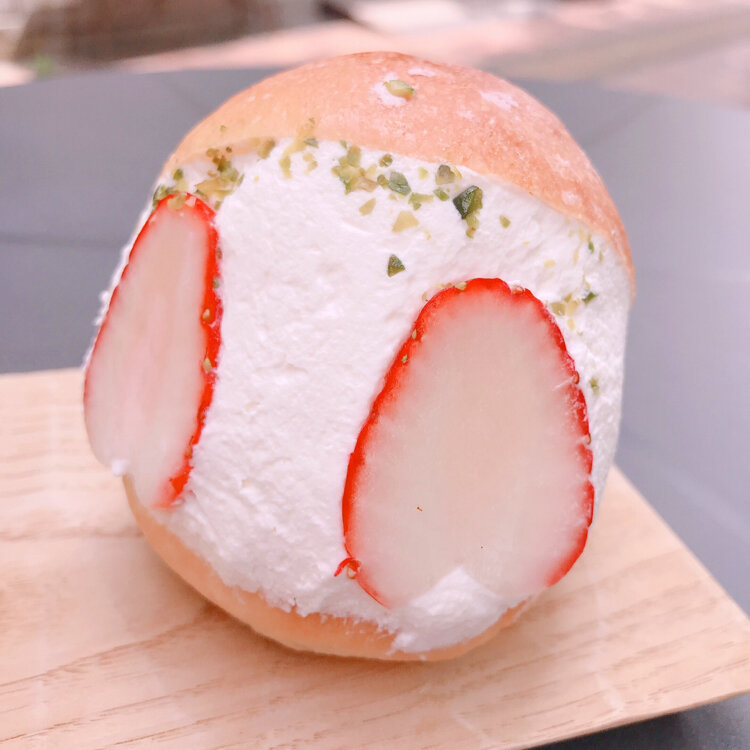 『こむぎさんちのパン』のブリオッシュに生クリームたっぷりといちごが挟まれています。