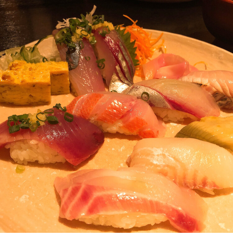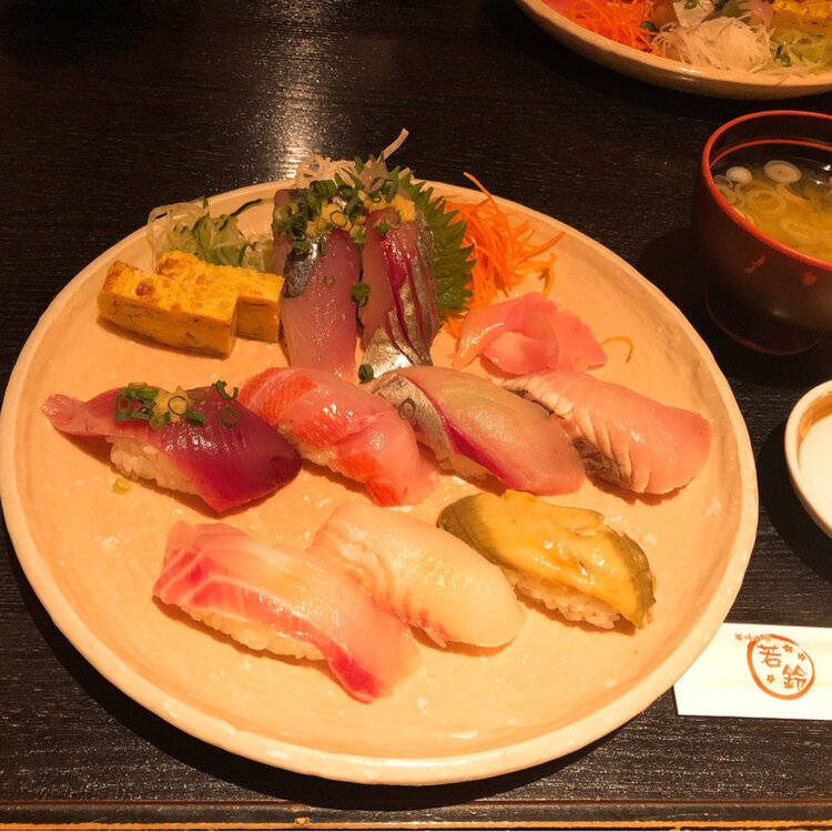 ー若鈴ー 地魚握り🍣 金目鯛、鰆、ヒラメ、鯵、鰹など 館山で獲れたお魚の握りです🐟 どれも肉厚で美味しいです😋