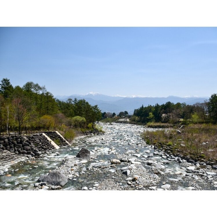吊り橋から川下方面に見えるのは南アルプス⛰️