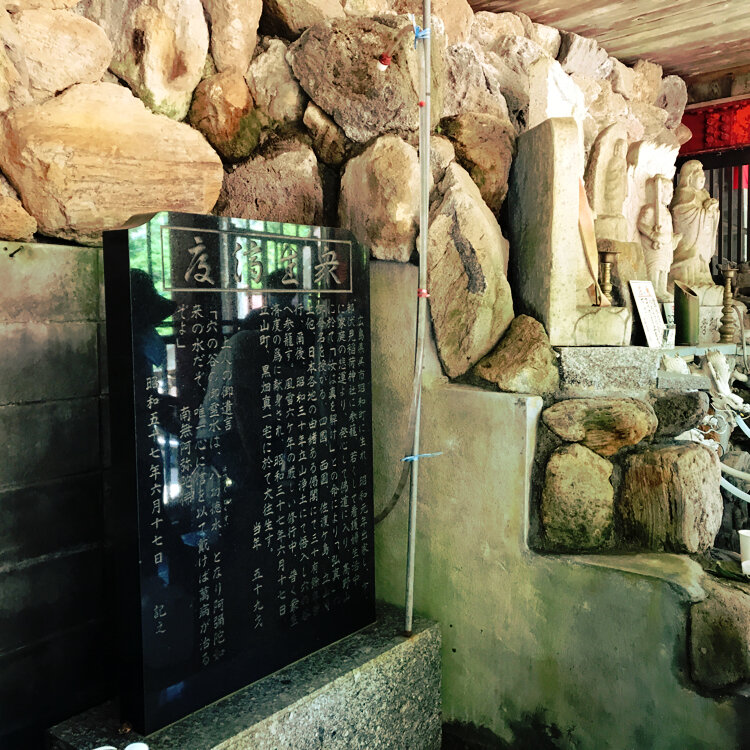 霊場の入り口でボトルを買って、三十三の観音像が並ぶすごく良い空気に深呼吸をがぶ飲みしながら山道を歩く事400m。長い階段を降りた『薬師如来堂』の側横に湧き出しています。