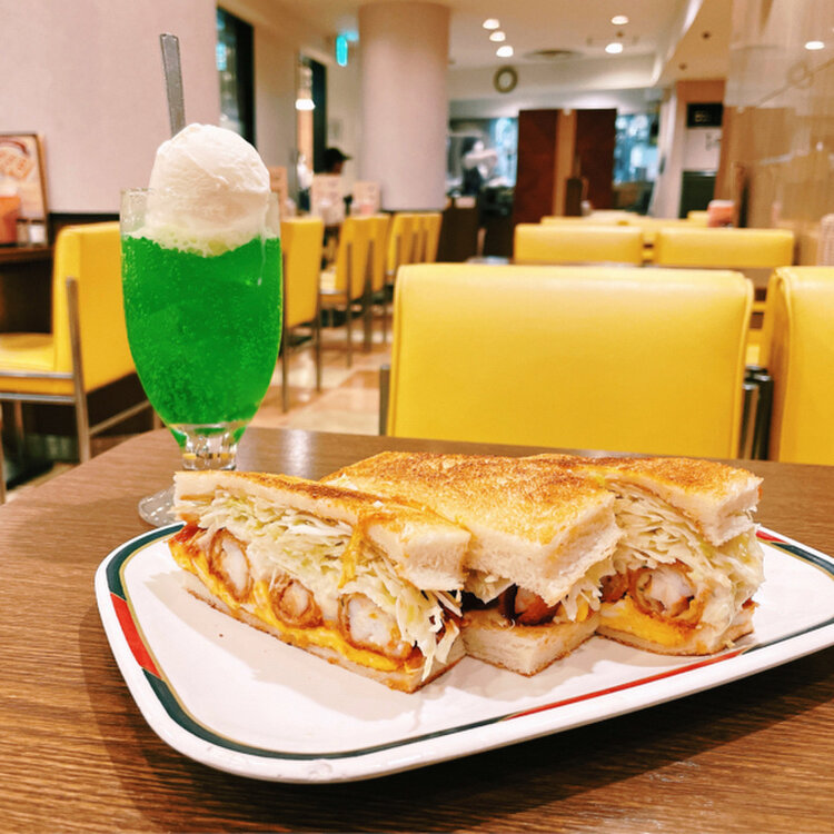 コンパル:栄 エビフライサンド クリームソーダ ・ ずっと行きたかったコンパル! テイクアウトと迷ったけど、空いてたしせっかくなら店内で😌 サンドイッチは卵も入って食べ応えがすごい!プリプリのエビフライがめちゃくちゃ美味しい…幸せ… クリームソーダはバニラアイスが甘めで美味しくて、量もちょうど良かったです 今度は大須の本店に行きたい🦐