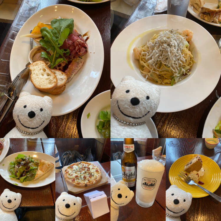 クマ散歩:ブロッソ デュエで品行方正なクマは前菜盛合せ、エビ・アンチョビ・しらすのペペロンチーノ、サルシッチャ&きのこのピッツァ、アサヒドライゼロ&自家製レーズンバターサンドの大船の昼下り The Bear had Antipasto Misto, Peperoncino Spaghetti with Shrimp, Anchovy and White Bait, Pizza with Salsiccia and Mushroom, Asahi Dry Zero & Sandwich Cookie with Raisin Butter early in the afternoon at Burosso Due, Ofuna!♪☆(*^o^*)