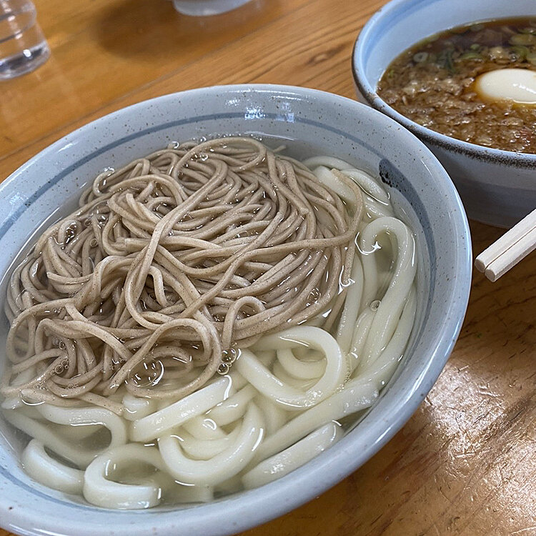 うどん0.5玉と蕎麦0.5玉に半熟卵をプラスした「湯つき」にしました。
