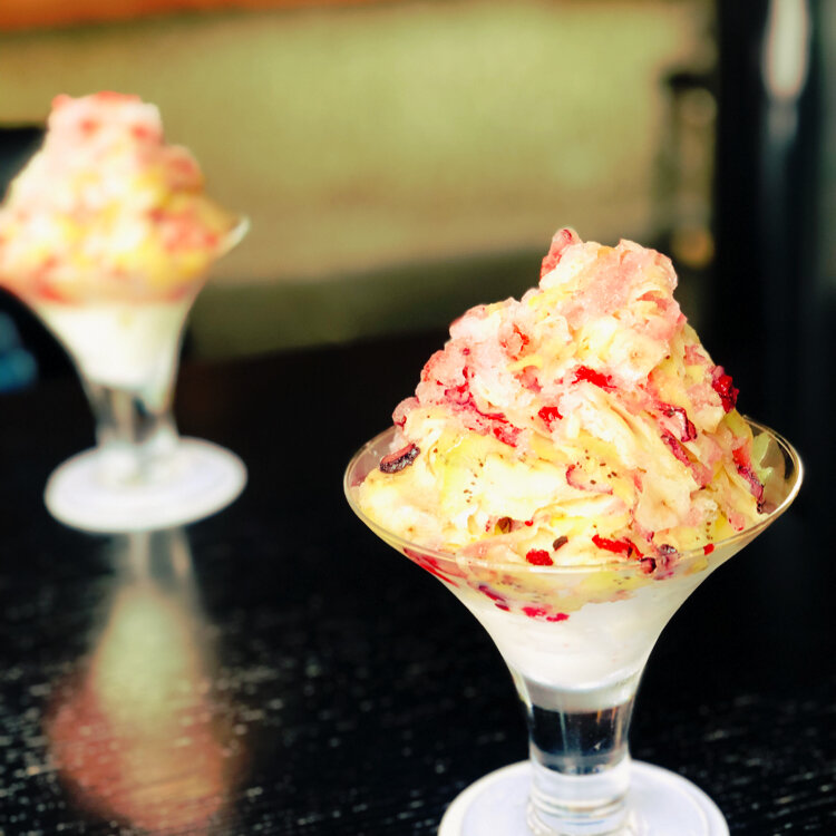 初めての花氷。 7種の果物を特製の蜜で凍らせたものを うすーくスライス。 かき氷とはだいぶ違う。 まるで綿菓子。 #小田原#カフェ#カフェ空#花氷#ミックス花氷#別腹なし
