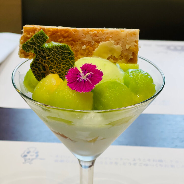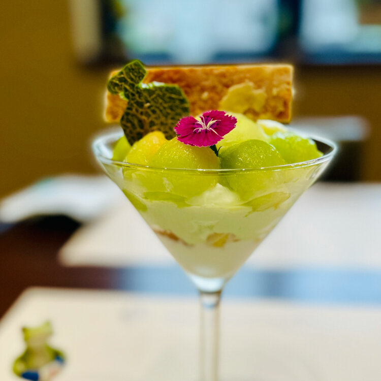 メロンパフェ🍈 ちっちゃいメロン🍈の飾りが可愛い💕 メロンのジェラート、メロンのパンナコッタ、 ヨーグルト、生メロン間違いない美味しいじゃん❣️ イタリアンレストランのドルチェです。 #夏色さがし