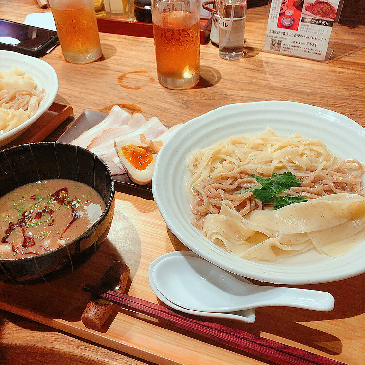 新しくできたラーメン屋さんへ🏃♀️🏃♀️ 「笑う門には福喜多る」というなんとも縁起の良い名前のお店です✨ 麺の種類が3種類あって、1種類から一そば、2種類でニそば、3種類で三そばというように選ぶことができます🙌🧡 わたしはもちろん三そばを選択😌💕 そしてチャーシューセットにしました!(税込1,025円) 濃厚な魚介風味のつけ汁ももちろん美味しかったのですが、昆布水につけられた麺がもうそれだけで絶品でした🌈✨