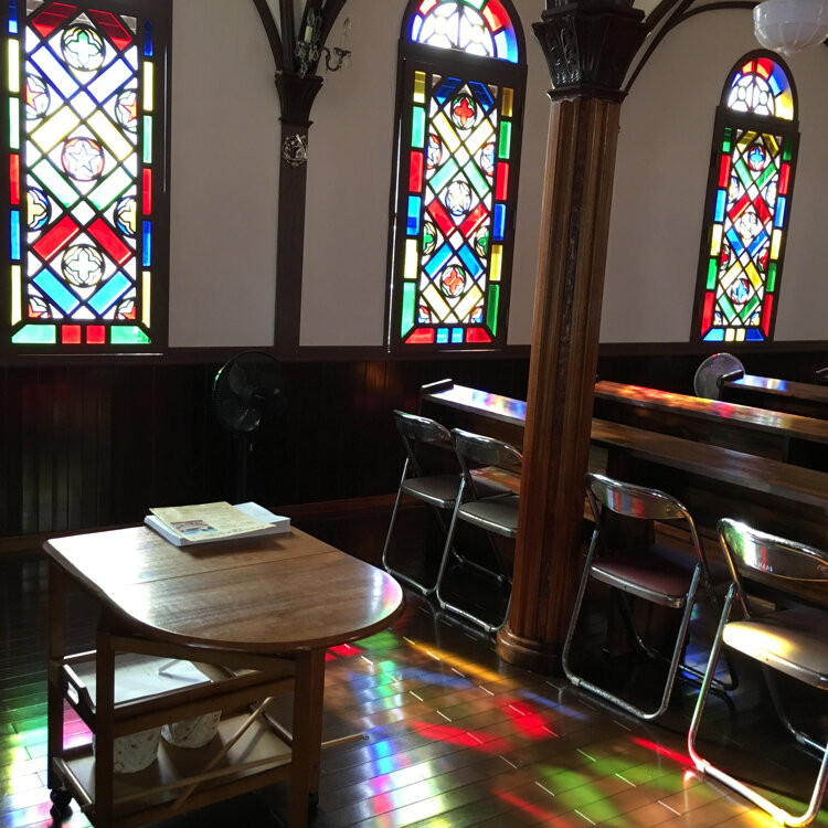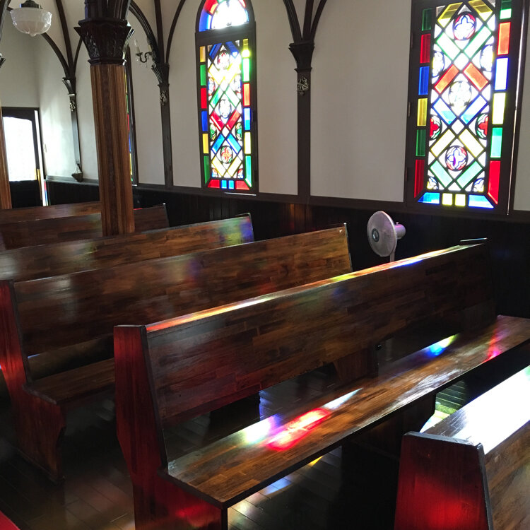海の近くの静かな高台にあるこの教会の扉を開くと、カラフルなステンドグラスの光でキラキラきらめいていました✨