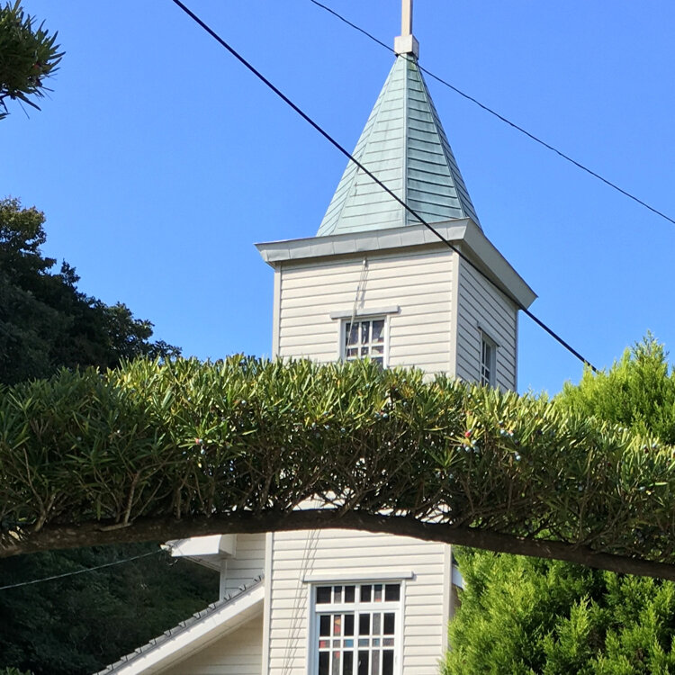 そして、水辺にある白く美しい中ノ浦教会のステンドグラスは十字になっていて、教会の中は椿の模様が可愛らしい❁⃘*.゚