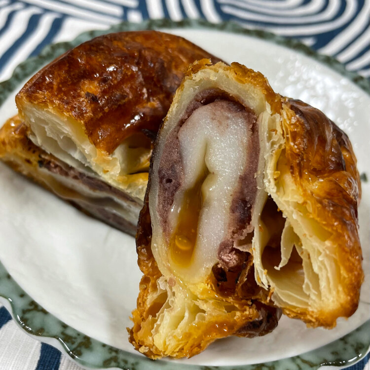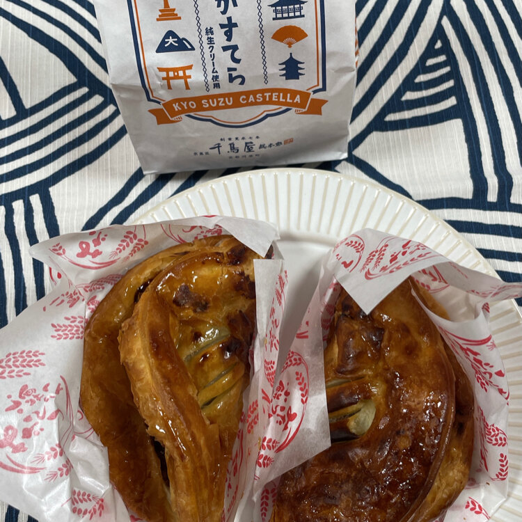 京都の千鳥屋さんの店頭には焼き立ての鈴かすてらとみたらし小餅が丸ごと入ったパイが販売されていて、素通りする事が出来ませんでした。