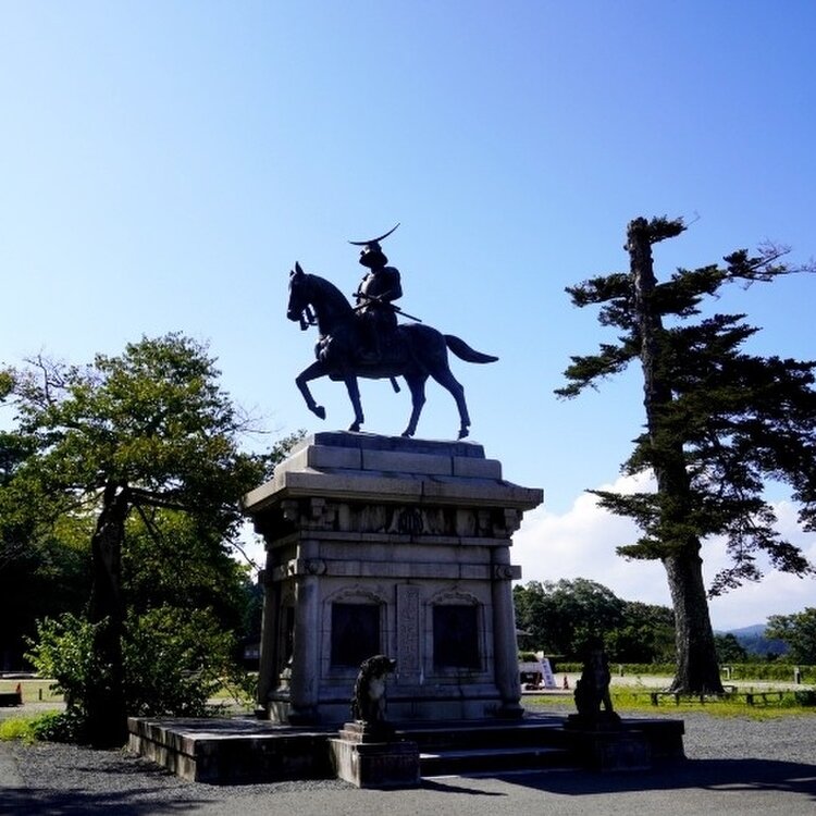 「宮城縣護国神社」へ。 近くには伊達政宗騎馬像、 青い空に映えカッコイイです。 みんなの厄難災難を吸い取ってくれた 厄難消除のひょうたんがいっぱい。