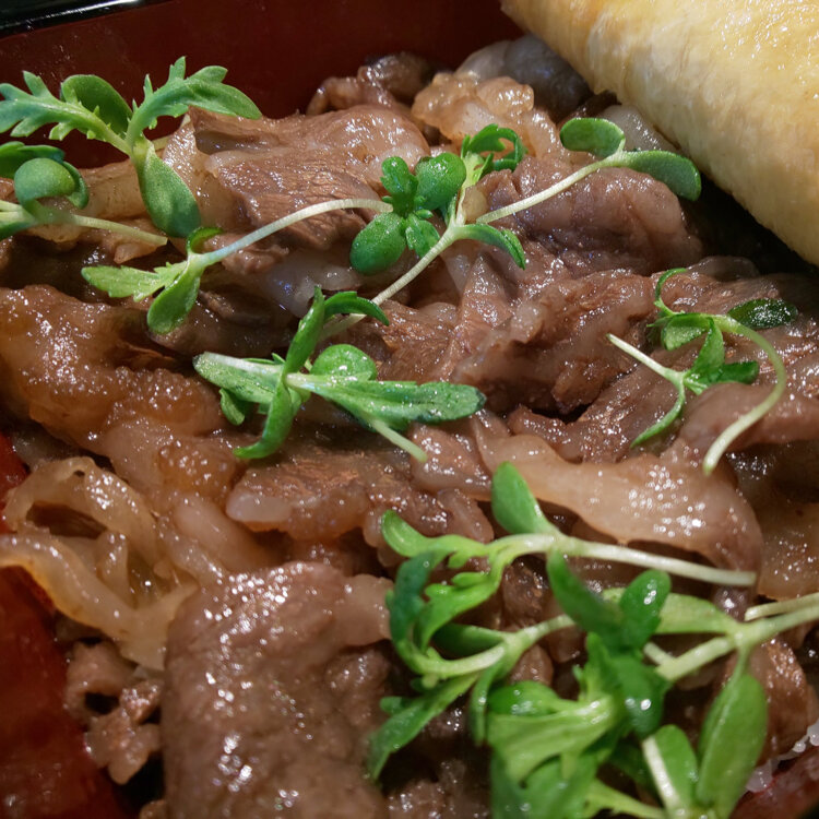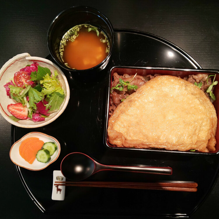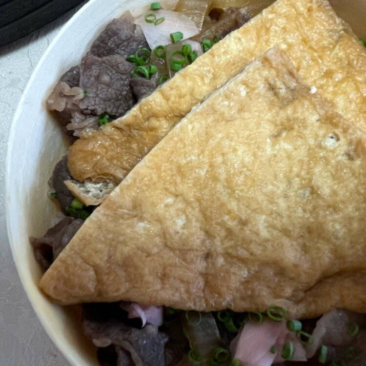 細かく刻んだ根菜を混ぜ込んだ酢飯に、柔らかい牛肉と甘辛く炊かれた大きなお揚げさんが乗っています😋