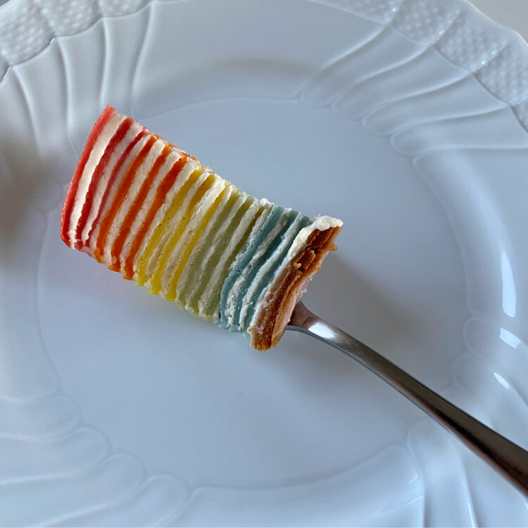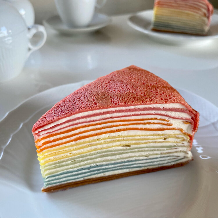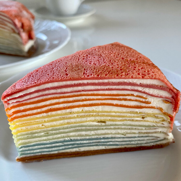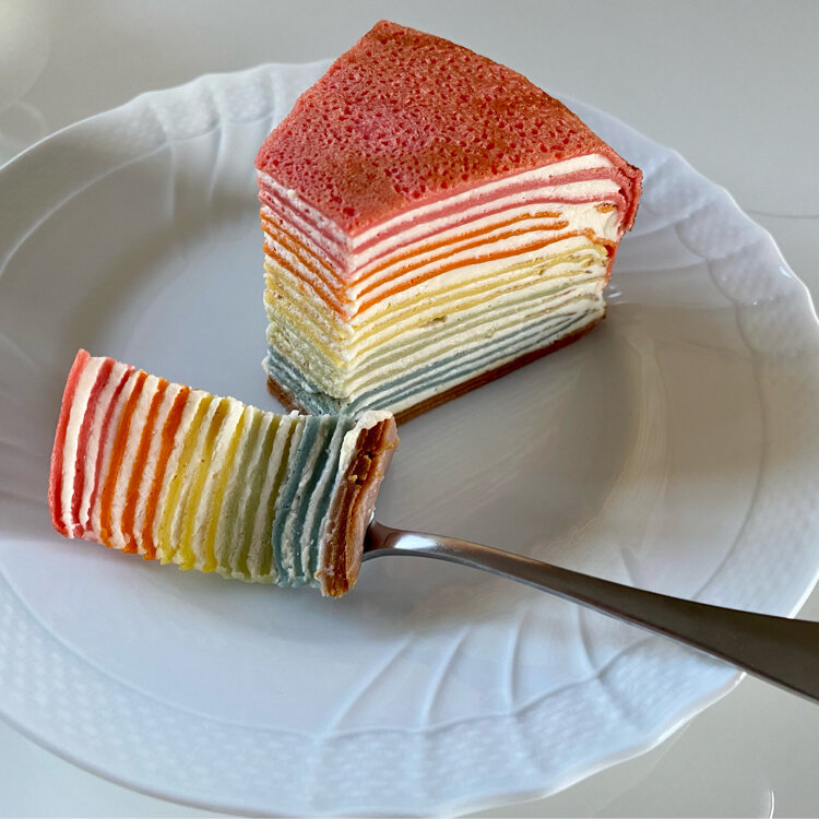 赤・オレンジ・黄・緑・水色・紫の6色のクレープ生地を3枚ずつ重ね、クリームで挟んだ計18枚。最下層のカラメルソースがほんのり甘苦い。