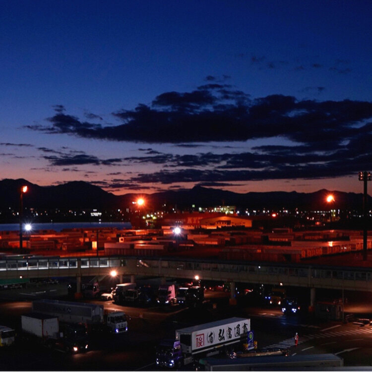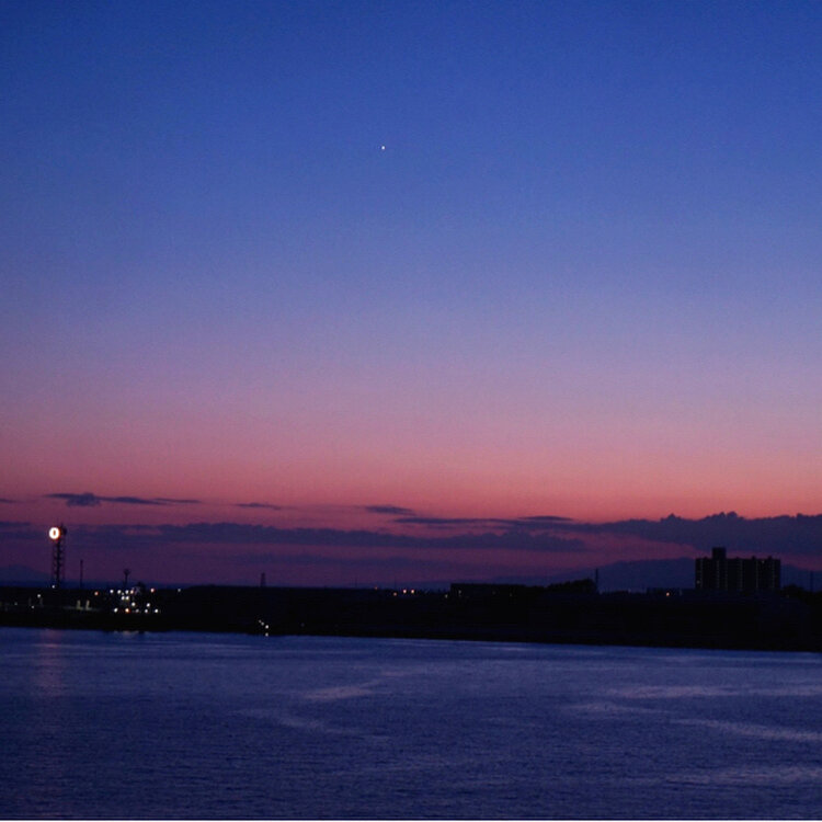 染まる水平線と山際、港口の灯台、港の信号、船やトラックの灯り…美しい自然の色とキラキラ。
