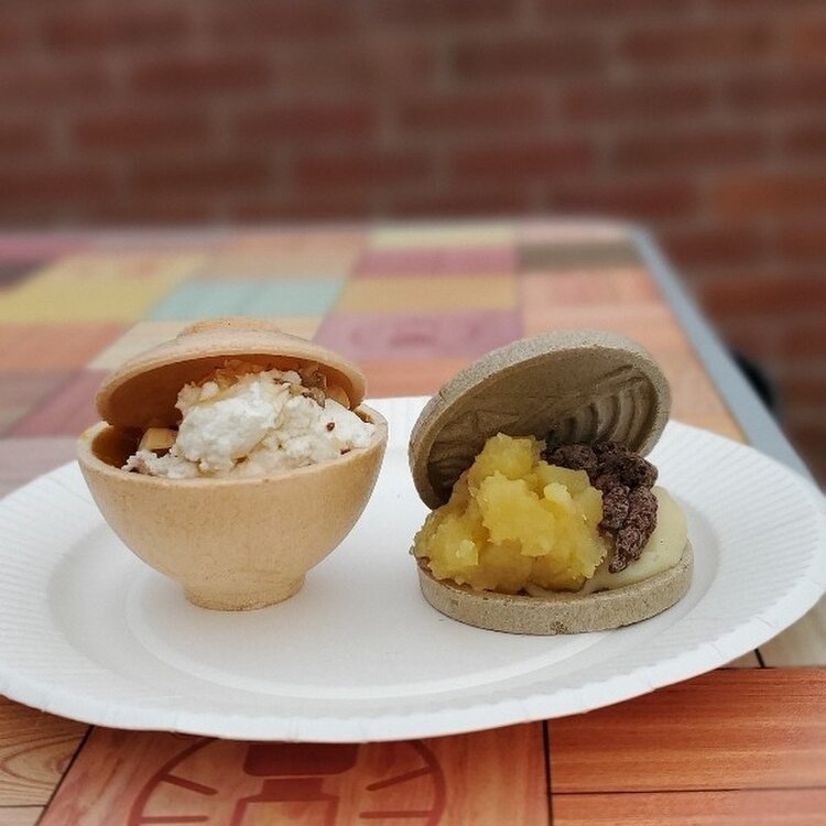 ちゃわん最中は佐賀県有田町のご当地最中で、蓋付き茶わんを型どった最中です🍜 中身はかぼちゃの餡とマスカルポーネにメープルシロップがけのナッツがはいっています💕