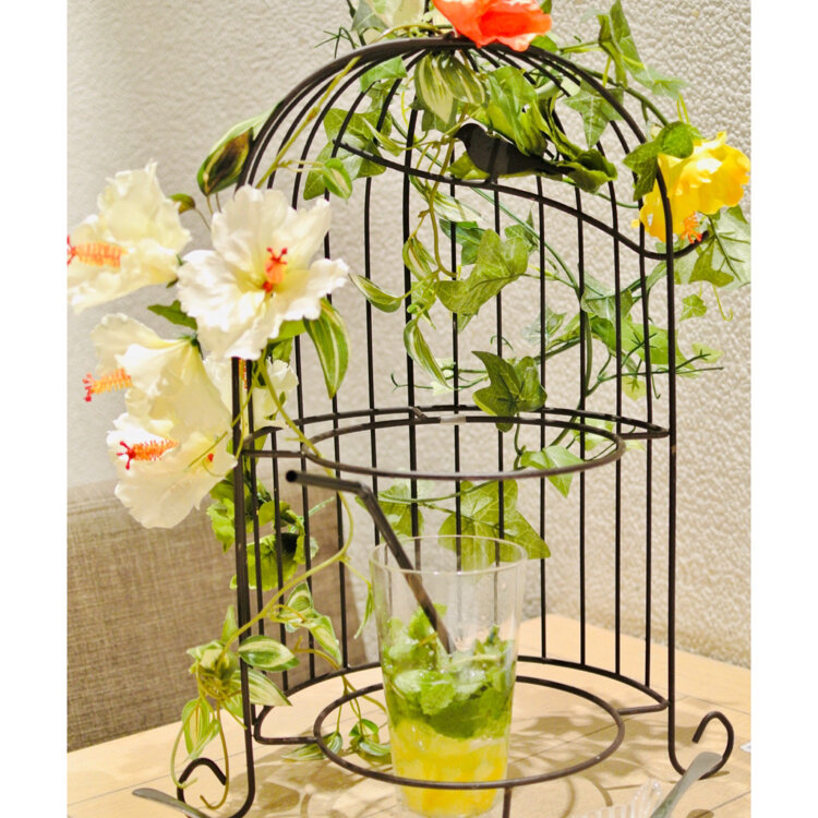 粉雪が降り積もったような鳥かごスタンドと