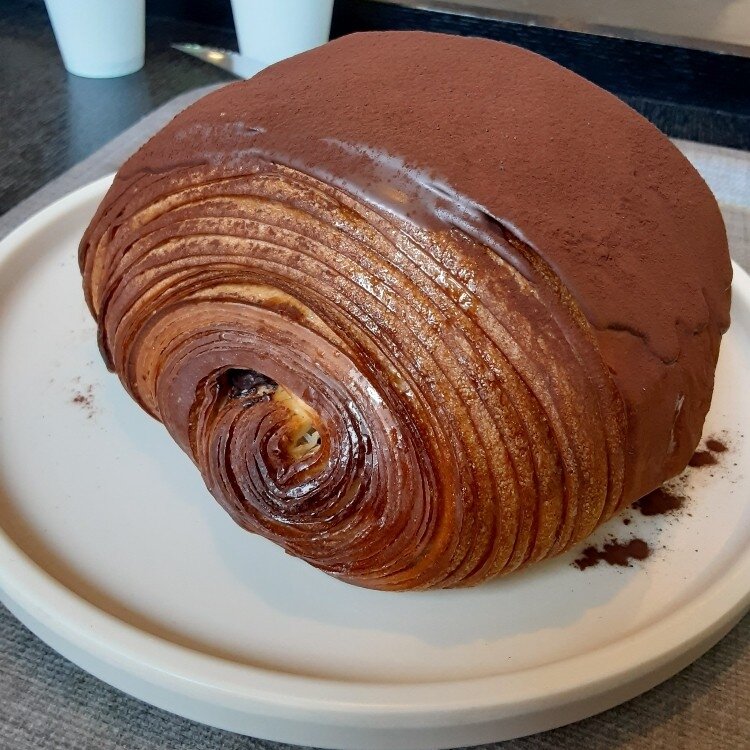 大きいチョコクロワッサン🥐 大きいクロワッサンにチョコのパウダーがかかっていました😋 韓国はパンやお菓子にこだわるところがいっぱいです🤩魅力たくさん🤩 サイズは少し大きいですがサクサクいってとても美味しいです👍
