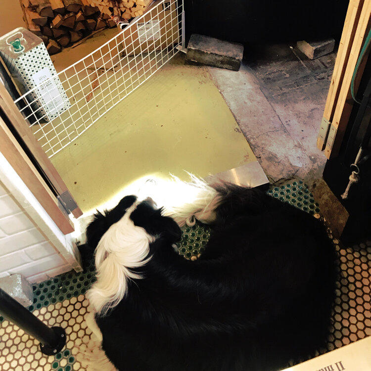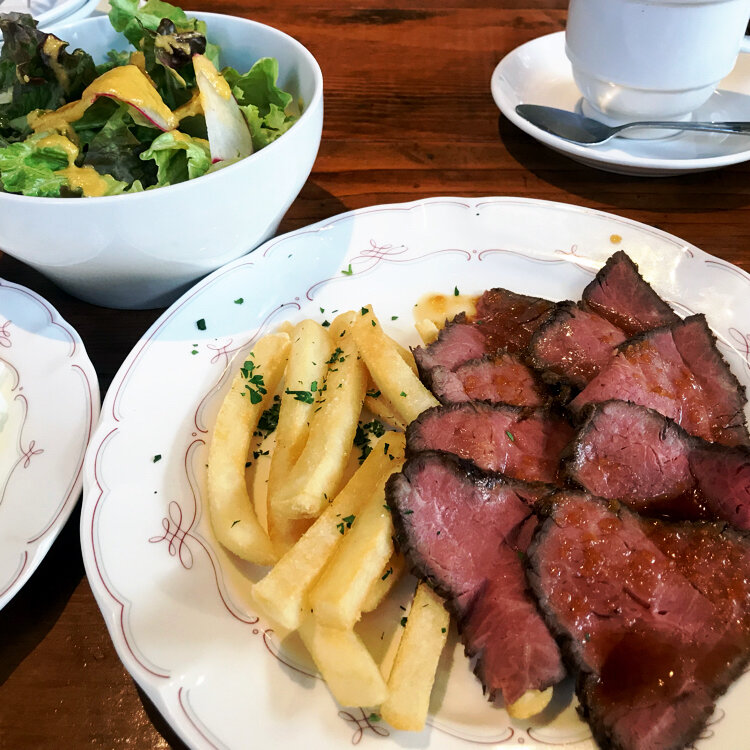 看板犬がお出迎え🐶 早稲田大学から5分の高田牧舎。 今日は満席の為、残念ながら看板犬のふくまる君はお休み、レオ君はピザ釜の横にいたので会えました。 黒毛和牛のローストビーフはしっとりボリューム満点です。