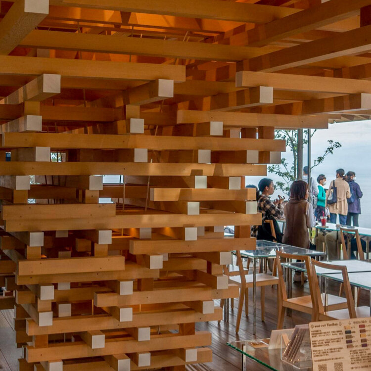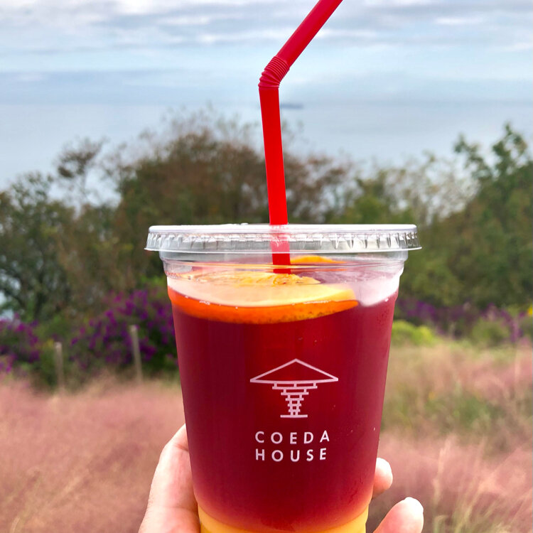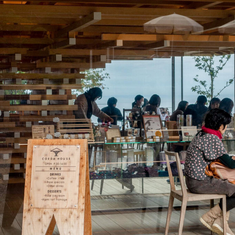 アカオハーブ&ローズーデンの山頂にある『コエダハウス』は、隈研吾さんの設計で下記のようなコンセプトで全面ガラス張りで、絶景を見られるようになっています。