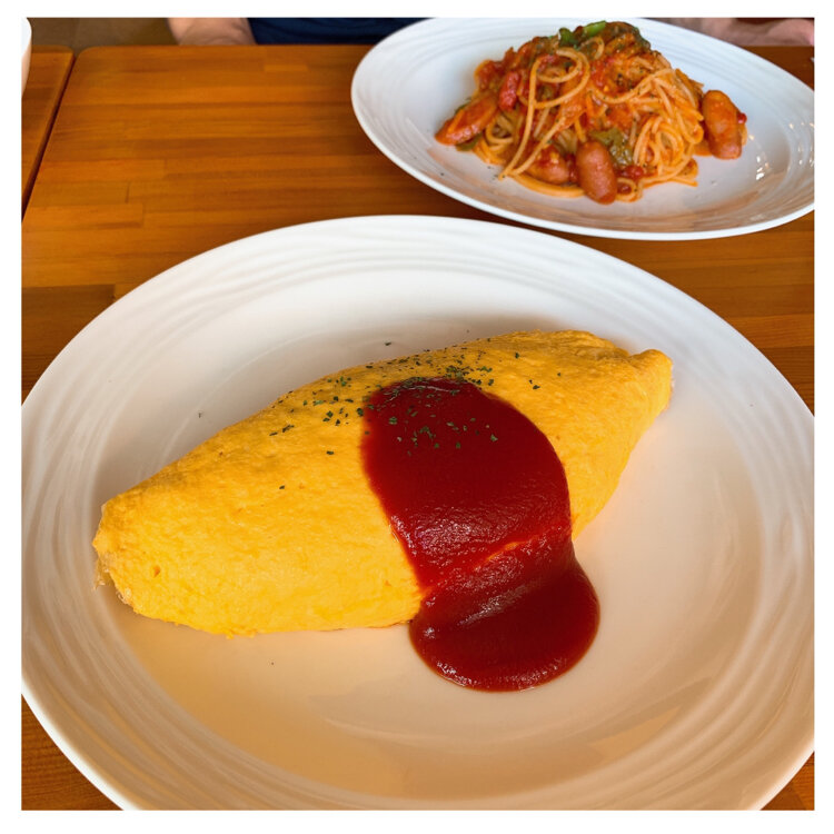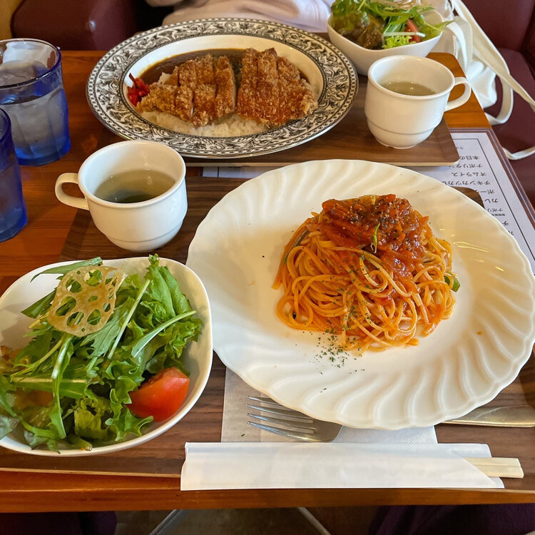 昨日も夜ごはんパスタやったのに、ここ来ると旦那はいっつもナポリタン😂私はオムライスに惹かれつつも前回選ばなかったチキンカツカレーを🍛