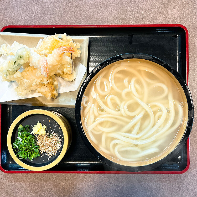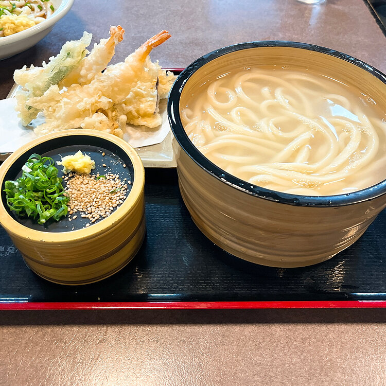 さぬき麺業さんで釜揚げうどんと天ぷらをいただきました。