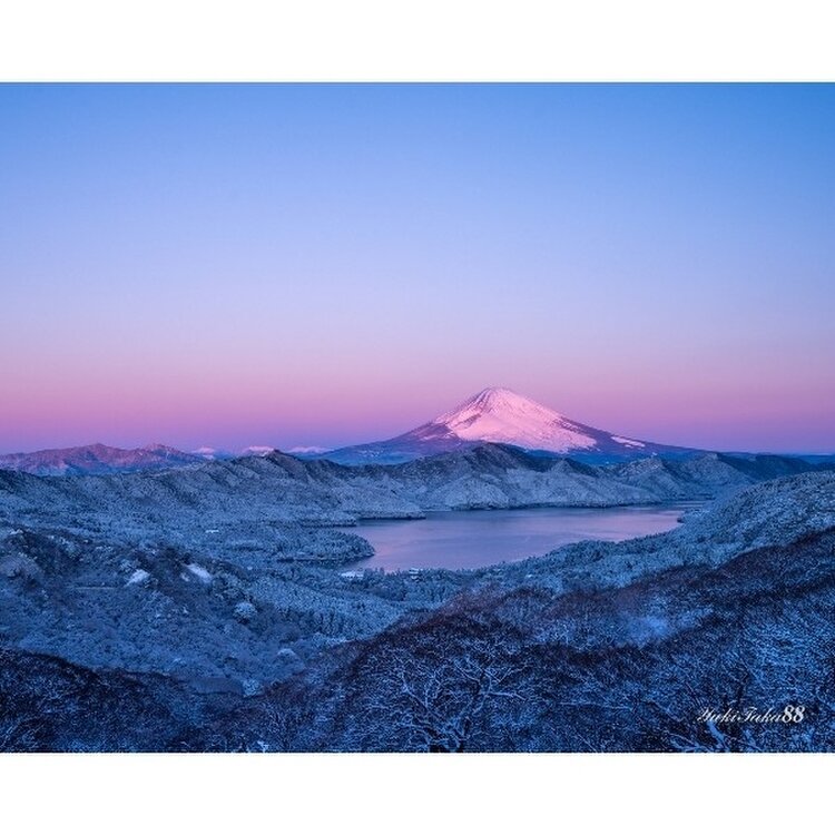 大雪となった関東、翌朝の白い雪景色、晴れ渡る空と、朝日に色付く紅富士🗻