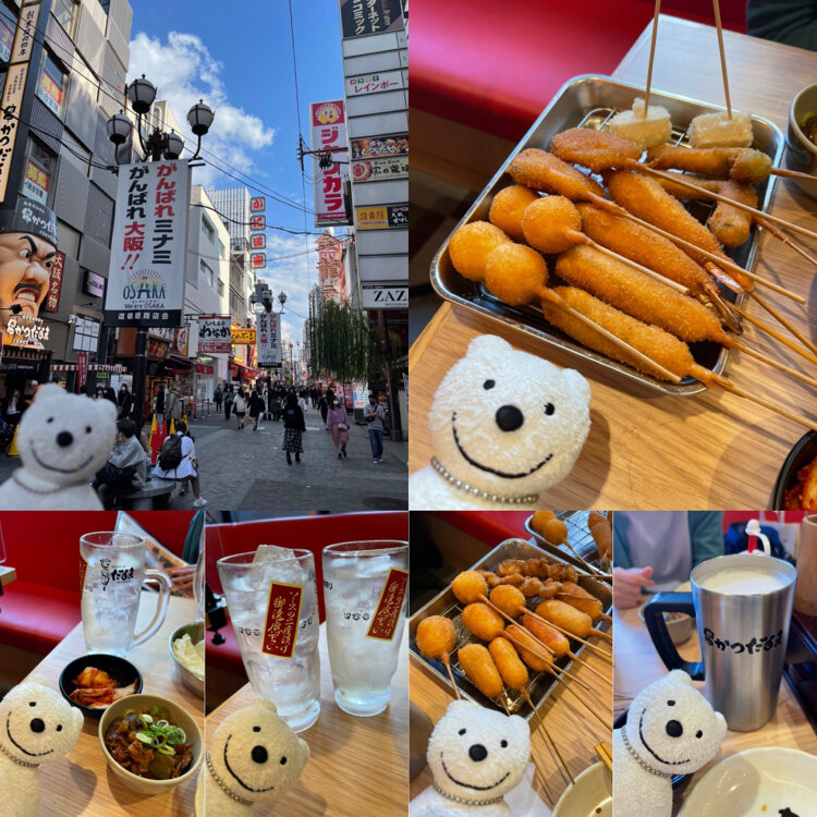 クマ散歩:元祖串かつ だるまで品行方正なクマは法善寺セット、レモンチューハイ&生ビール中の道頓堀の昼下り The Bear had a drink with Hozenji Skewers Set, Shochu Highball with Lemon & Beer on Tap M early in the afternoon at Ganso Kushikatsu Daruma, Dotonbori!♪☆(*^o^*)