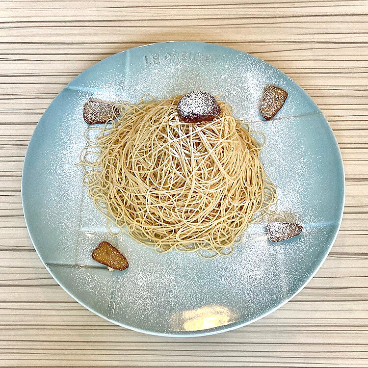 愛媛県産の栗と砂糖だけで作られた栗ペーストは贅沢で甘さ控えめ🌟ペーストの中に隠れているパイ+生クリームとも相性が良く、下にあるスポンジケーキに絡めて食べれば、また違った美味しさが楽しめる🌰