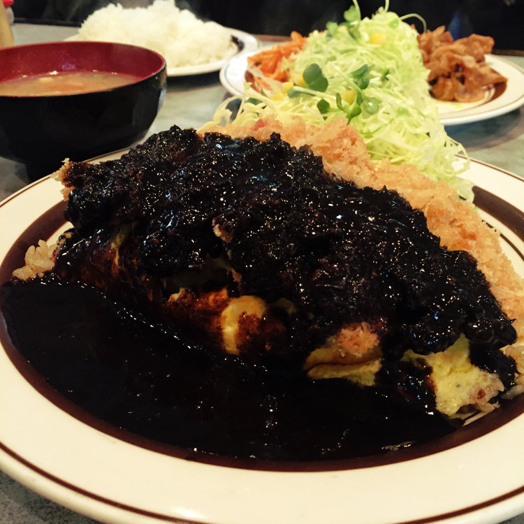 お腹空き過ぎて、エエィここだっ!ときめた小さな洋食屋さん。いや、ここが結構な繁忙店。余り期待せずに入ったので、混雑具合にびっくり。私が頼んだのは、オムライスにハンバーグをのせた欲張りなプレートにお味噌汁付き、相方は真っ黒なチキンカツカレーにお味噌汁付き。